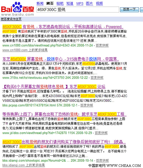 另据李先生介绍说,在家里的机器出现问题后,他也在网上积极寻找解决办法;却意外的发现东芝46XF300C液晶电视有很多都出现了类似的问题。